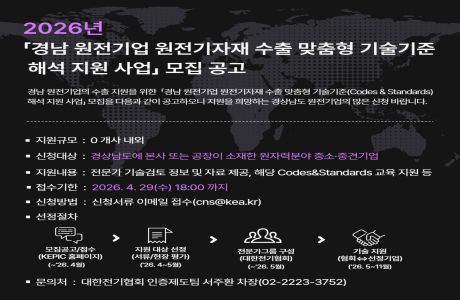 경남 원전기업의 수출 지원을 위한「경남 원전기업 원전기자재 수출맞춤형 기술기준(Codes & Standards)해석 지원 사업」모집을 다음과 같이 공고하오니 지원을 희망하는 경상남도 원전기업의 많은 신청 바랍니다. 1. 사업개요 □(목 적) 경상남도 원전 기자재의 중소·중견기업의 해외 진출 대상 국가 기술 요건 준수를 위한 적용Codes & Standards기술기준 해석 지원 □(지원규모) 0개사 내외 □(신청대상) 경상남도에 본사 또는 공장이 소재한 원자력분야중소·중견기업 □(사업기간) 공고일부터’26.11.6(금)까지 □(지원내용) 수출 추진 품목을 위한 대상 국가 품질·기술Codes&Standards적용 요건의 식별 및 목록화 등 전문가 기술검토 정보 및 자료 제공,해당Codes&Standards교육 지원 □(접수기한) 공고일부터 ~ 2026.4.29.18:00(약2주) □(신청방법)신청서류 이메일 접수(cns@kea.kr)